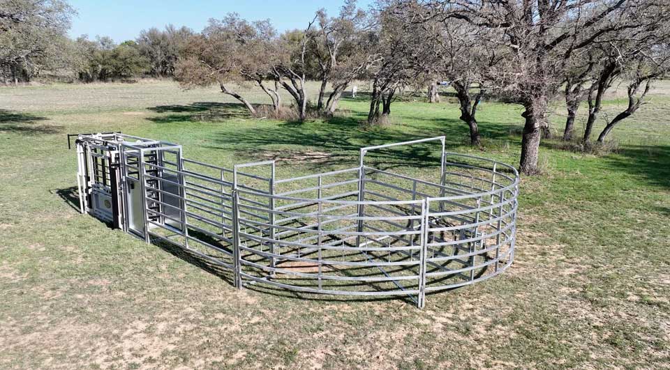 Complete cattle working system built around the Top Hand Self-Catch Squeeze Chute. Designed for better cattle flow, safer handling, and more control from the sweep tub all the way through the chute.